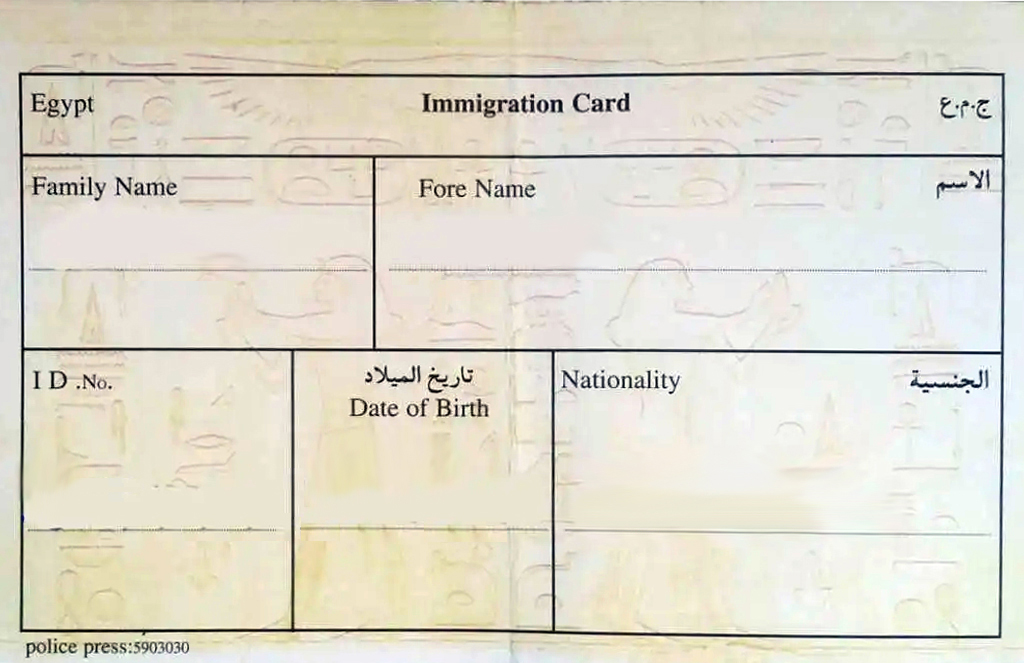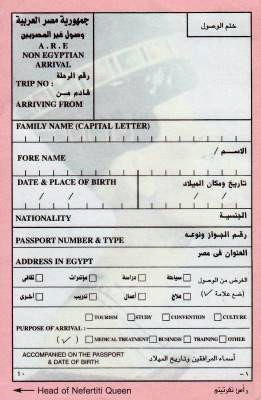 Ca. eine Stunde vor der Landung werden im Flugzeug Einreisekarten verteilt, die ausgefüllt werden müssen und bei der Passkontrolle einbehalten werden. Hotelgäste geben den Namen des Hotels, Nilkreuzfahrtgäste den Namen des Schiffes und Individualreisende, die in einer Ferienwohnung oder bei Freunden Urlaub machen, die Unterkunftsanschrift an.